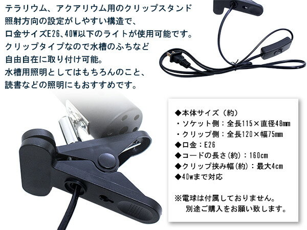 テラリウム、アクアリウム用のクリップスタンド!照射方向の設定がしやすい構造で、口金サイズE26、40W以下のライトが使用可能です。