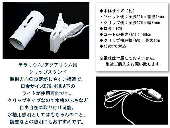 テラリウム、アクアリウム用のクリップスタンド!照射方向の設定がしやすい構造で、口金サイズE26、40W以下のライトが使用可能です。