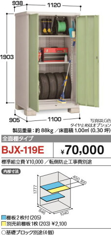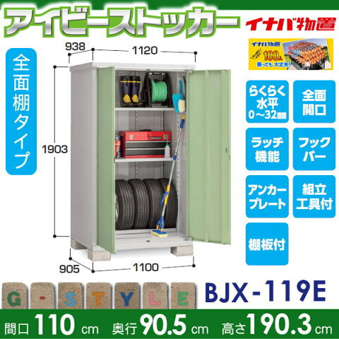 商 品 詳 細商品名イナバ物置 アイビーストッカー 間口1100×奥行905×高さ1903mm 全面棚タイプ BJX-119E 収納庫 屋外 小型物置 倉庫サイズ(mm)有効寸法:幅1120×奥行き938 内部寸法:幅1040×奥行き846×高さ1777床面積:1.00平方メートル(0.30坪) ブロック必要数4個(別途)棚板・アンカープレート(転倒防止兼用金具付)カラーチャコールグレー(CG)・ジェードグリーン(JG)・プラチナシルバー(PS)・エボニーブラウン(EB)送料・発送※送料無料 関東(東京都・神奈川県(離島除く))・東海(愛知県・岐阜県・三重県)エリア限定、配達のみ対応。