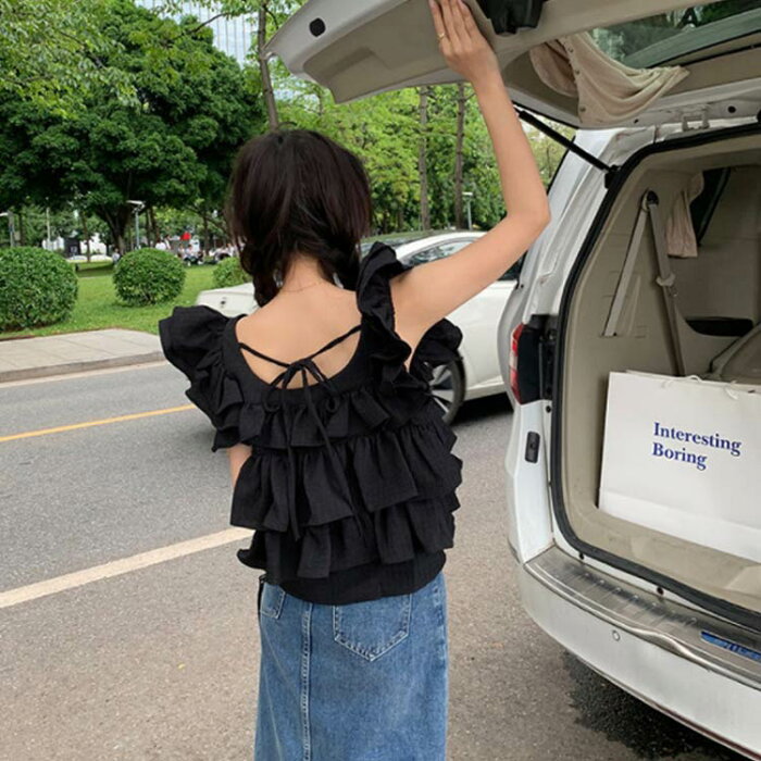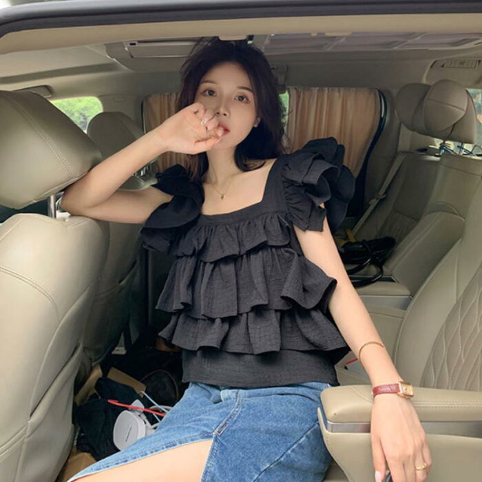 ブラウス 夏 レディース フリルブラウス フリル袖 ノースリーブ トップス 半袖 大人 可愛い スクエアネック ブラック ホワイト シャツ シンプル S-2XL きれいめ 上品 ファッション 20代 30代 黒 白 送料無料
