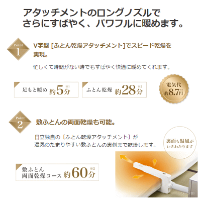 V字型 [ふとん乾燥アタッチメント]で 忙しくて時間がない時でもすばやく快適に暖めてくれます。